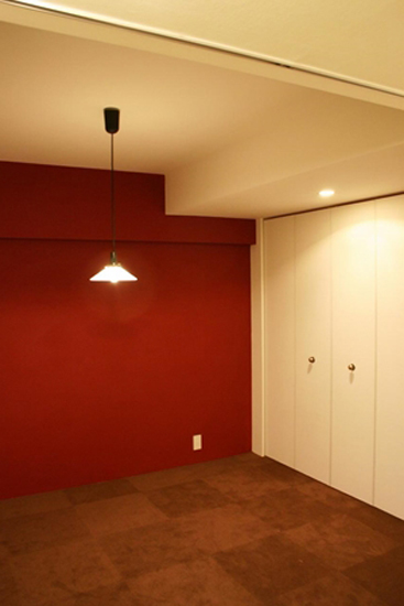 装修TIPS:深棕色瓷砖的地板,便于主人清洁打扫。步入式的衣橱,具有大容量的收纳功能,使得小家更加干净整洁。红色的一面墙壁,鲜艳的色彩,使得空间更具有活力。
