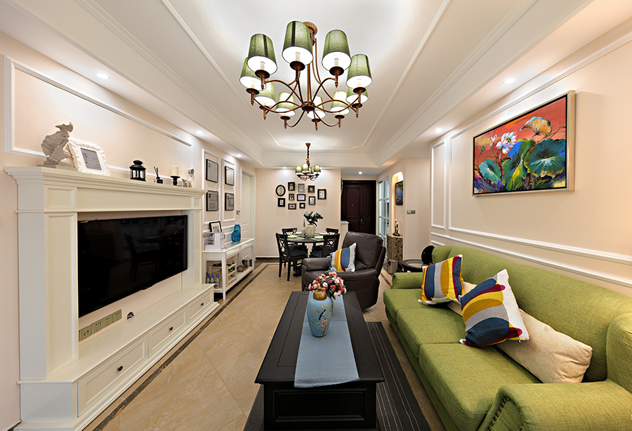 客厅采用暖色为主色调。充满美式元素的客厅吊顶让空间显得更加华贵。整个客厅给人带来清爽明快之感,宽敞的空间布局让人更加舒畅,单一的色调让人就看不腻。空间布局、色彩用用、材质的选择,都突出了简约又大气的风格。客厅用了大胆的绿色以及地面的仿古砖来体现出回到大自然的味道,整体给人一种简约大气的感觉,没有反复的空间布局,每处都格外的干净利落。无论是客厅的吊灯,脚下的地板,没有琐碎多余的设计,表面光滑柔和,让人感觉温暖而舒适。
