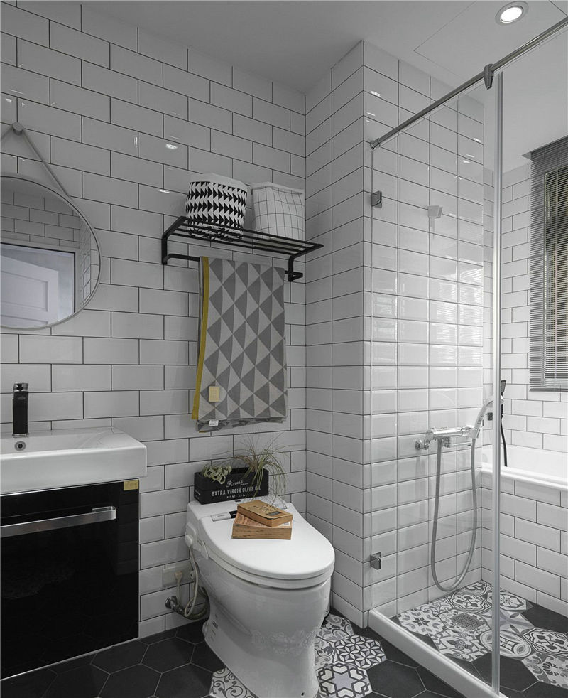 卫生间面积很大,用玻璃隔断做了干湿分离。淋浴区和马桶下面用当下最受欢迎的花砖,设计感强。