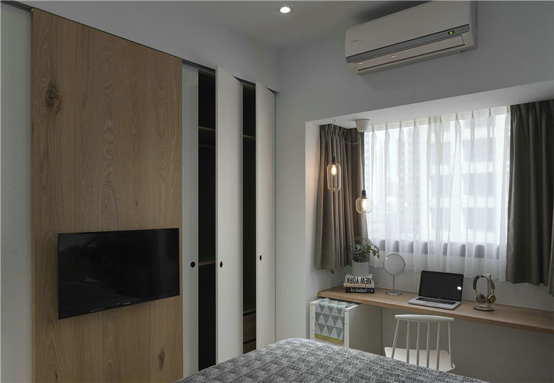 卧室依旧沿用客厅的淡灰色,清爽透彻。入墙式衣柜收纳空间大,电视也安装到移门了。